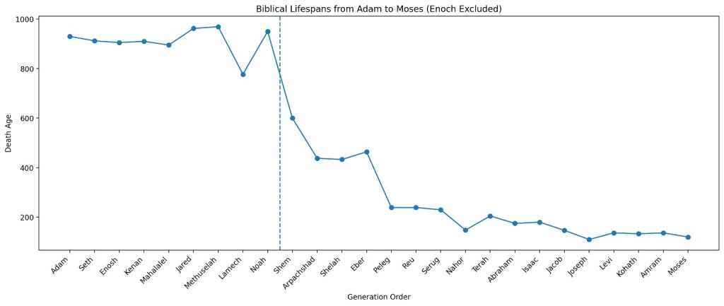 When the death ages from Adam to Moses are charted, excluding Enoch because he was taken by God and does not fit normal mortality, the pattern is stronger than it may first appear.